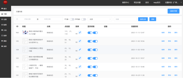 我们日常最多的工作就是发布文章,发布推文,点击左边的菜单栏可以进行发布文章。进去首先看到文章的列表页面,页面右上角上有发布文章的按钮,下来就是搜索栏,搜索栏中可以根据条件进行搜索出想要的文章,也可以搜索出自己设定文章模版,通过复制文章模版,然后发布新文章,提高发布新文章效率。 最下面就是文字列表,